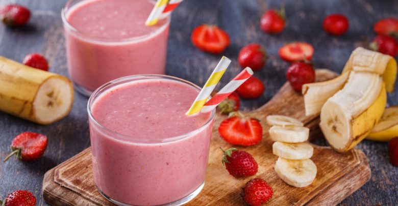• Comenzamos licuando el agua, la leche evaporada y la leche condensada. Además, ponemos la mitad de cada una de las frutas: 12 fresas, 1 manzana, 1 1/2 de plátano y 1 1/4 de guayaba y las nueces. Las licuamos junto con el agua.