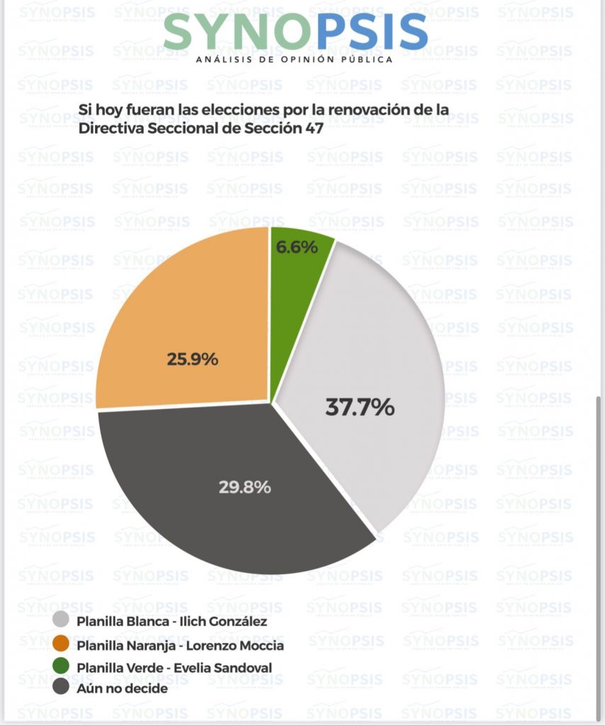 La medición realizada con el magisterio que votará para elegir a su dirigente sindical el próximo viernes 14 de octubre, pone a la cabeza a Ilich González de la planilla blanca con un 37.7%, seguido de Lorenzo Moccia de la planilla naranja con el 29.8% dejando a Evelia Sandoval de la planilla verde con apenas un 6.6%.