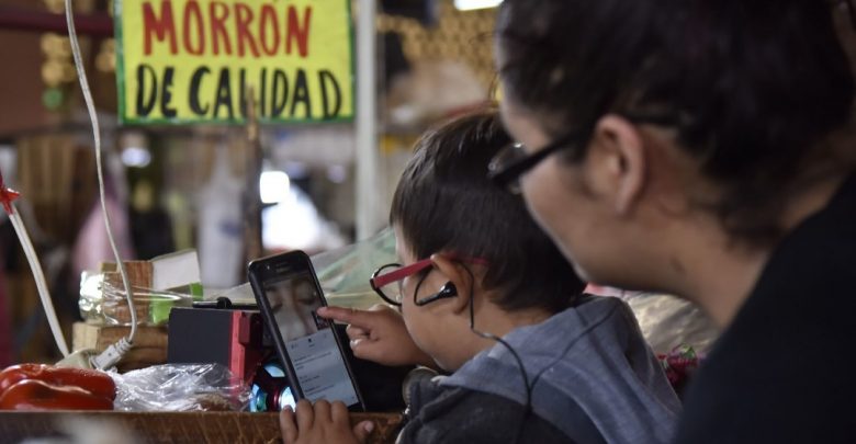 Entre arreglos de rosas, crisantemos y margaritas, Valery de 4 años de edad toma clases en línea con el teléfono celular de su mamá, pues comerciantes del Mercado Juárez han tenido que adaptar pupitres en locales para que sus hijos puedan tomar las clases ya sea en línea o a través de la televisión.