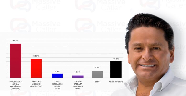 Respecto a los candidatos, Massive Caller reporta a Cuauhtémoc Ochoa (Morena) con un 43.5 por ciento frente a Carolina Viggiano (PRI) con un 22.7.