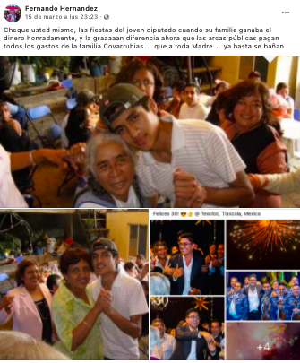 Cheque usted mismo, las fiestas del joven diputado cuando su familia ganaba el dinero honradamente y la gran diferencia ahora que las arcas públicas pagan todos los gastos de la familia Covarrubias… que a toda m… ya hasta se bañan’ se lee en el texto del post.