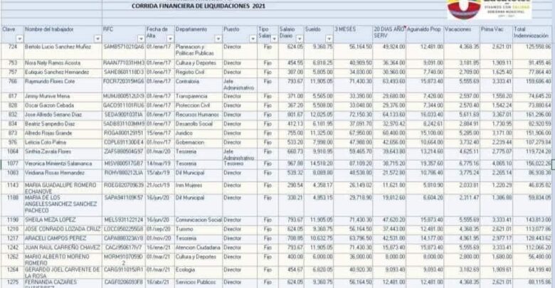 La denuncia hecha pública en redes sociales, detalla que, por ejemplo, Leticia Coto Palma directora de gobernación recibirán 107 mil pesos de liquidación.