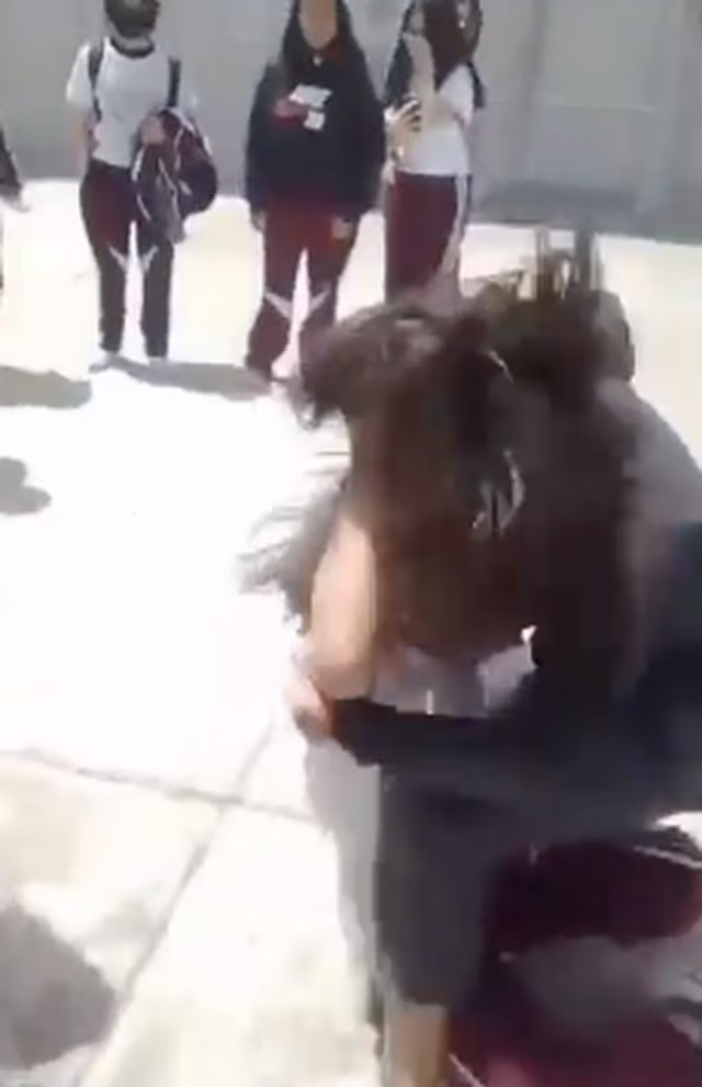 Posteriormente, la alumna sometida en el piso logra jalar del cabello a su compañera y levantarse, para que ambas continúen su pelea de pie, jalando su ropa y cabello hasta tirarse al piso nuevamente.