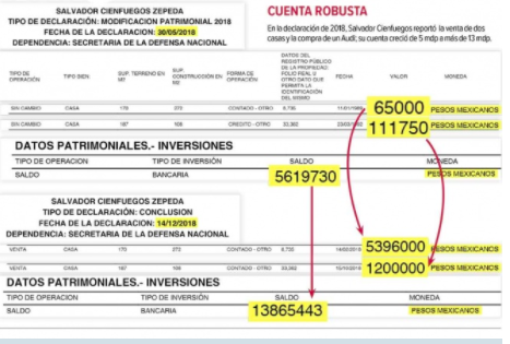 Las dos propiedades que, según la declaración patrimonial Cienfuegos vendió fue una que tenía un valor de 65 mil pesos, en cinco millones 396 mil pesos, que databa de 1985 y otra propiedad, de 1992, que tenía valuada en 111 mil 750 pesos y que vendió en un millón 200 mil pesos, para un total de 6 millones 595 mil pesos. Las dos operaciones inmobiliarias fueron al contado.