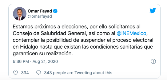 Hasta el momento, la fecha para llevar a cabo las elecciones en Hidalgo es inamovible, aunque el gobernador hidalguense, Omar Fayad ha indicado a través de sus redes sociales que se ha solicitado al Consejo de Salubridad General, así como al INE contemplar la posibilidad de suspender el proceso electoral en Hidalgo hasta que existan las condiciones sanitarias que garanticen su realización.