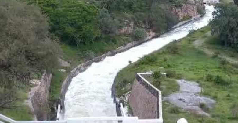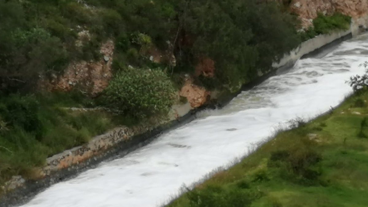 La espuma es visible en el dren de Valsequillo que desemboca en la presa del mismo nombre, autoridades piden a la población no acercarse a la zona para evitar cualquier situación de riesgo.