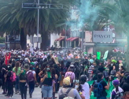 Mujeres encapuchadas que participan en la marcha por el Día de Acción Global por un aborto Legal y Seguro lanzaron cohetones y bombas molotov en contra de las oficiales de la Secretaría de Seguridad Ciudadana (SSC) que les impiden el paso por avenida Juárez hacia la zona de la Alameda Central.