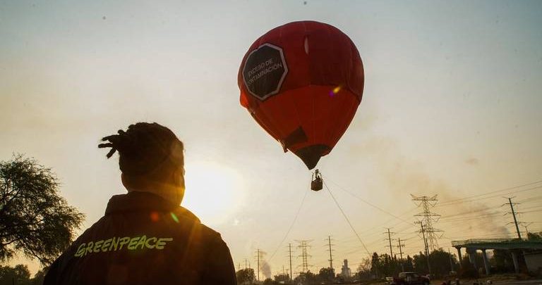 En el marco del Día de la Tierra el grupo ambientalista elevó un globo aerostático frente a las instalaciones de la termoeléctrica con la etiqueta “Exceso de contaminación”, para advertir que en ese lugar se quema combustóleo que rebasa el límite máximo establecido por las normas.