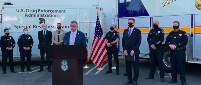 “Esta es suficiente droga para dar a probar una dosis de metanfetamina a cada hombre, mujer y niño en Estados Unidos y México”, dijo en rueda de prensa Timothy J. Shea, de la DEA, en un almacén en Montebello, cerca de Los Ángeles, y frente a una pirámide de tres metros con la droga decomisada: “Estudio tras estudio muestra que donde hay adicción a metanfetaminas, hay un aumento de violencia, robos, asaltos y asesinatos”.
