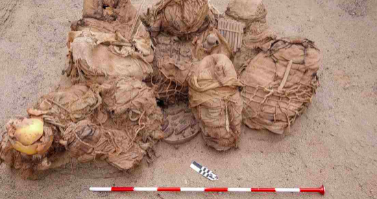 Los ocho fardos de adultos y niños estaban envueltos con cuerdas vegetales y telas de color marrón, sepultados en lo que sería parte de un cementerio prehispánico. Alrededor de los restos se encontraron ofrendas de alimentos e instrumentos musicales de viento, como conchas de abanico, platos de comida con diversas especies de maíz, una zampoña y una flauta.