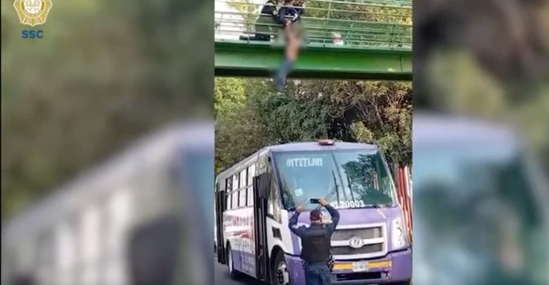 De manera simultánea, otros policías pidieron el apoyo de un camión de transporte público para que se colocara debajo del puente y de esa forma bajar a la persona.