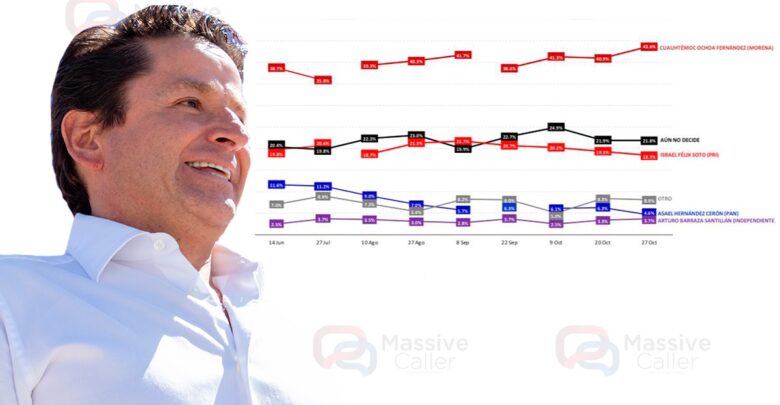 Una encuesta telefónica de Massive Caller realizada al 27 de octubre coloca a Cuauhtémoc Ochoa como el mejor posicionado en los careos entre aspirantes al gobierno de Hidalgo por el partido Morena.