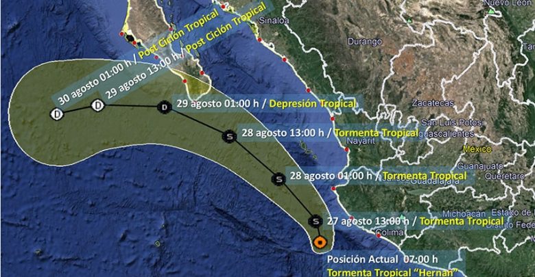 Este jueves, la tormenta tropical ‘Hernán’, se localizará al suroeste de las costas de Jalisco y en interacción con fuerte entrada de humedad el Océano Pacífico, mantendrá el temporal de lluvias intensas a puntuales torrenciales, así como rachas fuertes de viento y oleaje elevado de 3 a 5 metros en las costas de Nayarit, Jalisco y Colima, informó el Servicio Meteorológico Nacional (SMN).
