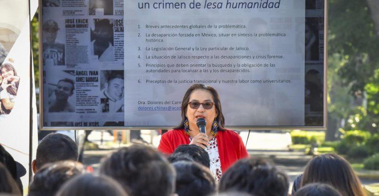 Sobre la avenida Manuel Acuña, frente a Casa Jalisco, 120 estudiantes y profesores del Centro Universitario de Ciencias Exactas e Ingenierías (CUCEI) de la UdeG, asistieron a la quinta master class titulada “Desapariciones en Jalisco”, dirigida al gobernador y dictada por la Coordinadora del Comité Universitario en Análisis en Materia de Personas Desaparecidas, del Centro Universitario de Ciencias Sociales y Humanidades (CUCSH), doctora Carmen Chinas Salazar.