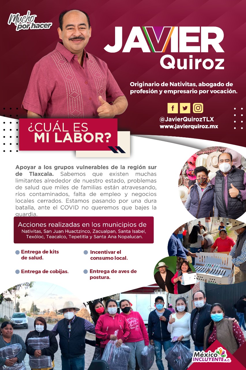 Javier Quiroz Macías es un empresario oriundo de Nativitas, ex alcalde y papá de 4 hijos, actualmente dedica su tiempo a la actividad social al frente de la asociación Civil México Incluyente.