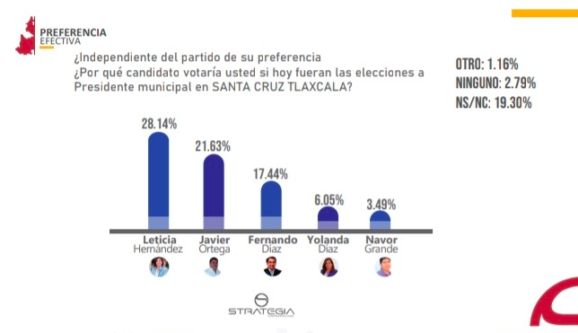 Una encuesta de la casa ‘Estrategia’, posiciona a Leticia Hernández Pérez, como la favorita entre la ciudadanía de Santa Cruz, Tlaxcala para ocupar la candidatura a la presidencia municipal por el Partido Acción Nacional (PAN).