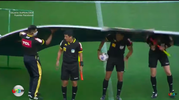 Antes de iniciar un partido de futbol, los árbitros que participaron en el juego fueron sorprendidos por un letrero publicitario que les cayó sobre la cabeza. En redes sociales, se observa el momento en que una estructura metálica, sobre la que había publicidad, se les vino encima por el viento que había. Uno de los árbitros intentó detenerlo, pero no pudo hacer mucho, ya que a sus otros compañeros sí los golpeó en la cabeza. El incidente no pasó a mayores y el partido continuó.