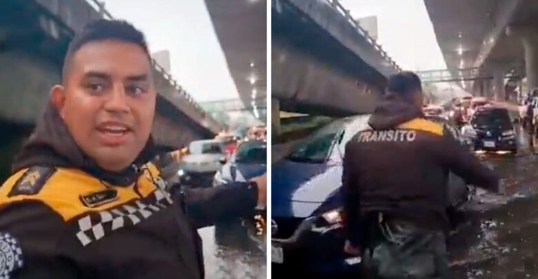 En redes sociales circula un video que muestra a un policía de Tránsito de CDMX meterse al agua, al parecer en los carriles centrales del Periférico, para agilizar un embotellamiento a causa de un encharcamiento.