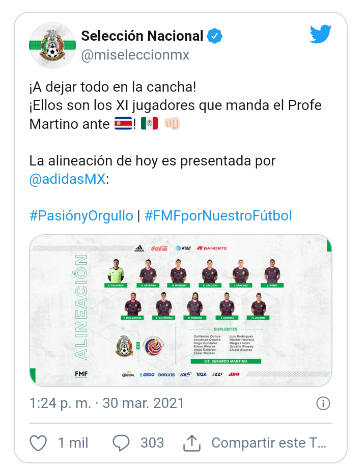 1:20 PM | Se confirma la alineación de México para enfrentar a Costa Rica. Alfredo Talavera, Jorge Sánchez, Carlos Salcedo, Héctor Moreno y Gerardo Arteaga, Jonathan dos Santos, Erick Gutiérrez y Luis Romo, Jesús ‘Tecatito’ Corona, Rodolfo Pizarro e Hirving ‘Chucky’ Lozano.