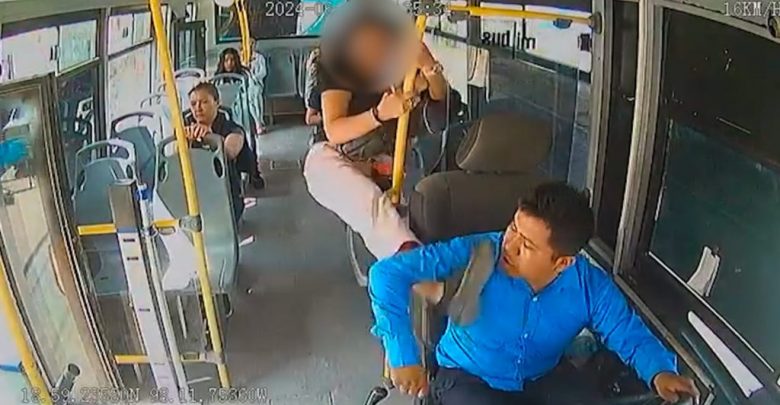 El chófer intenta calmar a la mujer, quien se molesta más y comienza a amenazar al hombre con reportarlo y, sin dejar de insultarlo, se sienta justo detrás del conductor para después patearlo en varias ocasiones.