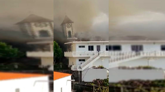 En el video se puede ver como la iglesia de Todoque, conocida como la iglesia de San Pio X, empieza a humear para posteriormente ser consumida poco a poco por el material incandescente, hasta que la torre de la iglesia colapsa.