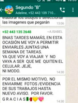 Vía WhatsApp, la maestra Isabel les compartió que durante una semana no estará al frente del grupo virtual y pidió además a las mamás de sus alumnos que no le envíen testigos de sus tareas y trabajos.