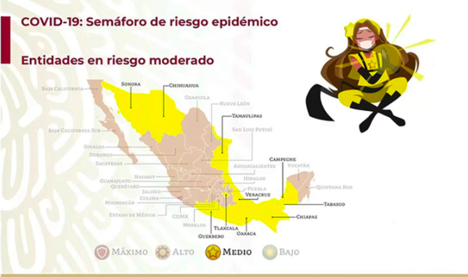 Ricardo Cortés Alcalá, director general de Promoción de la Salud, aseveró que el mapa nacional posee ahora sólo un estado en color rojo del semáforo epidemiológico, Colima, lo que significa que hay máximo riesgo para la población, así como una incidencia alta de hospitalizaciones. El resto de los estados se mantienen en color naranja y amarillo.