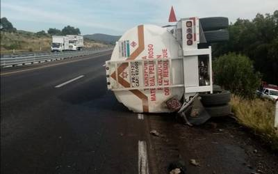 Una pipa de gas de doble remolque se salió del camino y volcó de la autopista México-Puebla a la altura de la junta auxiliar de San Felipe Hueyotlipan, esta tarde.