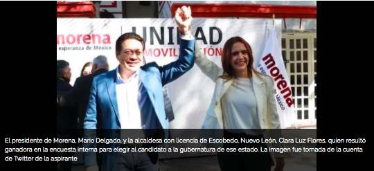 La alcaldesa con licencia del municipio de Escobedo, Nuevo León, Clara Luz Flores, será la candidata de Morena a la gubernatura en las elecciones del 6 de junio de 2021, tras ganar la encuesta interna de ese instituto político.