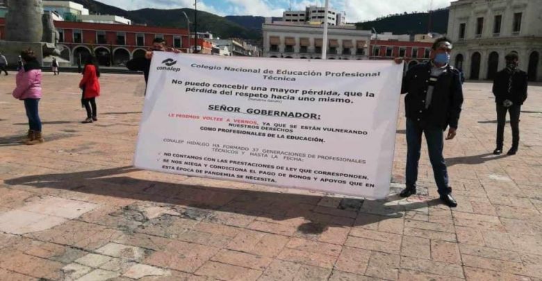 Profesores del Colegio Nacional de Educación Profesional Técnica (Conalep) se manifiestan frente a Palacio de Gobierno de Hidalgo para exigir que no se les niegue ni condicione el pago de un bono anual que desde hace dos años perciben, pues argumentan, lo requieren para afrontar la contingencia sanitaria.
