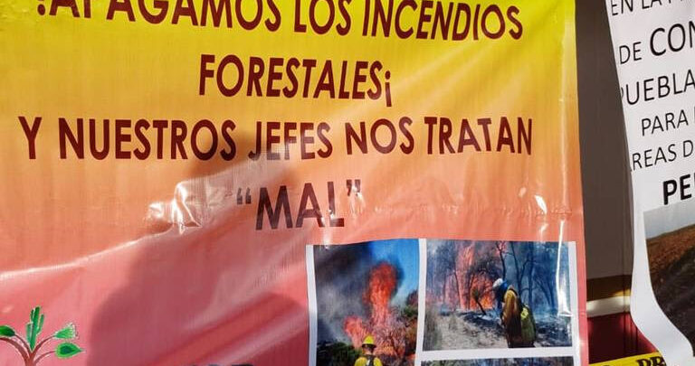 “Apagamos incendios forestales y nuestros jefes no tratan mal” y “Promovemos uso sustentable de los recursos forestales y solo recibimos de nuestros jefes malos tratos”, son algunas inconformidades plasmadas en las mantas.