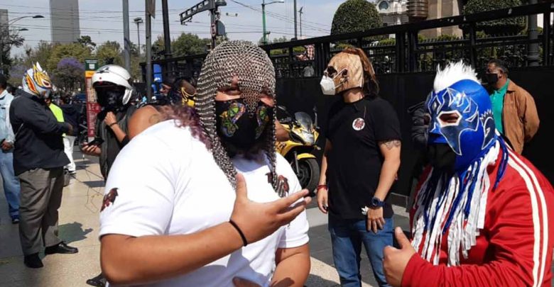 Un grupo perteneciente a la Organización de Luchadores acudió a la calle Francisco I. Madero al cruce con la Avenida Eje Central Lázaro Cárdenas para solicitar la reapertura de plazas donde se lleva a cabo sus espectáculos.