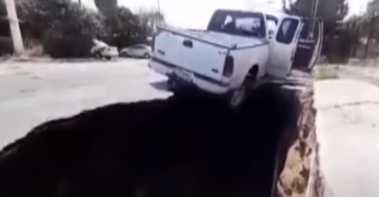 Elementos de Protección Civil y Bomberos llegaron al punto donde se abrió el socavón, donde dos camionetas estuvieron a punto de ser “tragadas”.