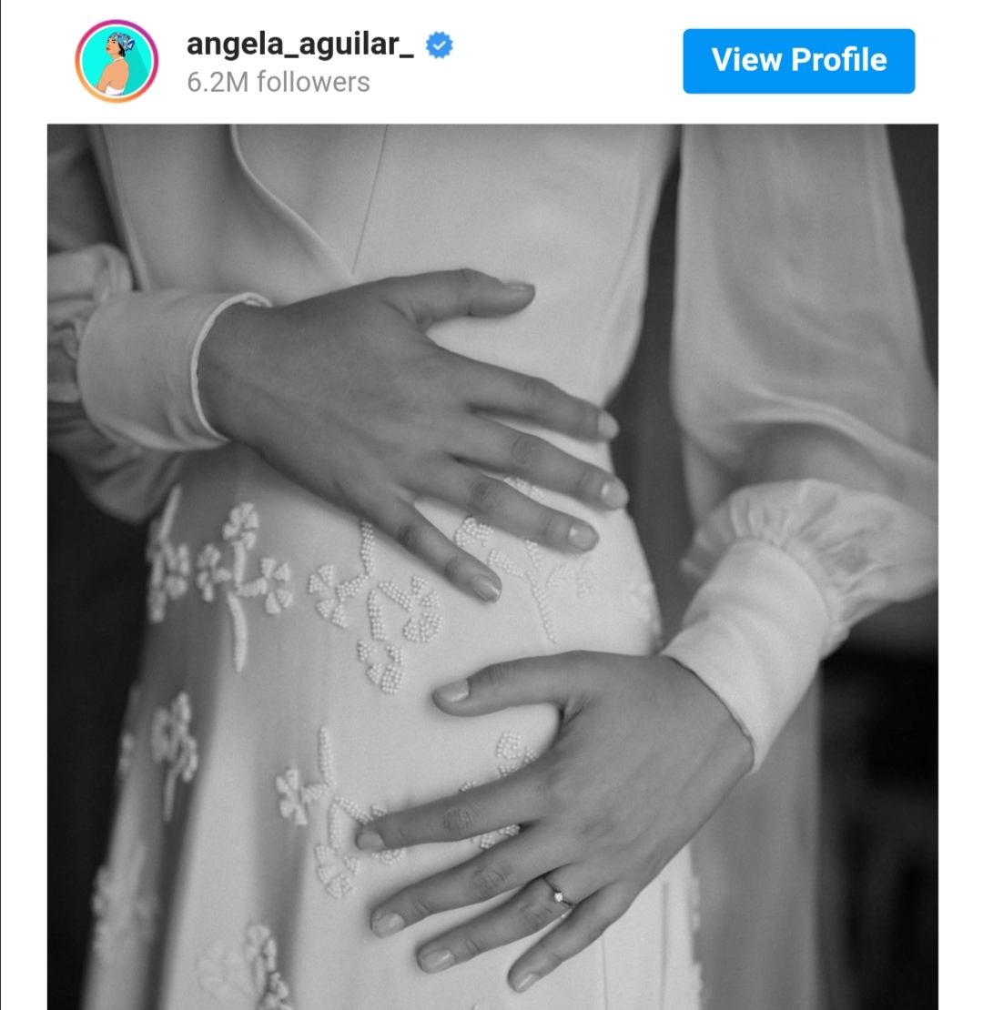 En su comentada imagen, Ángela Aguilar luce un vestido largo con detalles de bordado. Aunque no deja ver su rostro, la joven de 17 años se toca parte de su vientre y por si fuera poco, en una de sus manos lleva el que podría ser un anillo de compromiso.