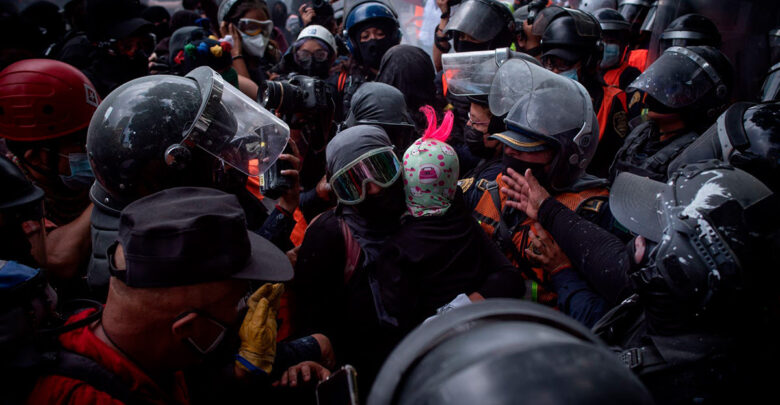 Se enfrentan feministas y mujeres policías en protesta en CDMX