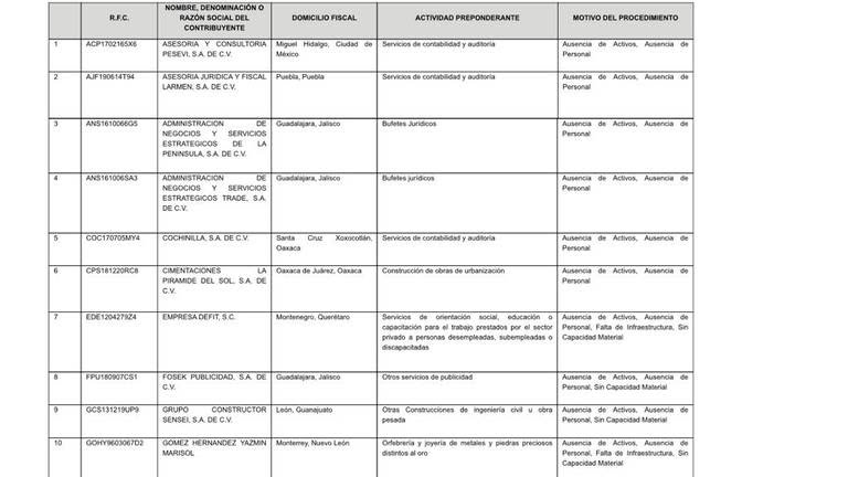 Según el documento publicado y con ello el oficio número 500-05-2021-25837, este listado se debió a que emitieron comprobantes fiscales sin contar con los activos, personal, infraestructura o capacidad material para prestar los servicios o producir, comercializar o entregar los bienes que amparan tales comprobantes.