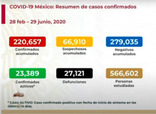 Autoridades de la Secretaría de Salud informaron este lunes que el número de muertos por coronavirus en México llegó a 27 mil 121, mientras que los casos confirmados alcanzan los 220 mil 657.