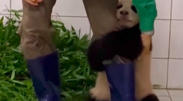 En las imágenes, Fu Bao es pesada sobre una báscula antes de ser apoyarla en el suelo, cuando entonces enrolla sus patitas delanteras alrededor de la pierna del cuidador, mientras éste intenta alejarse.