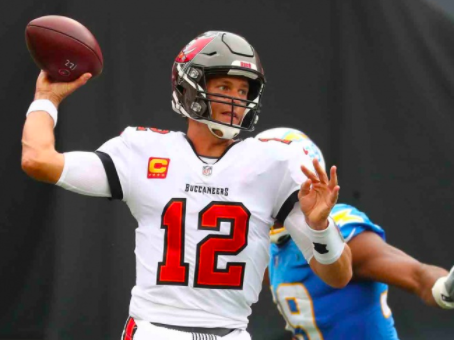 Tom Brady lanzó para 369 yardas y cinco touchdowns, todos a diferentes receptores, para ayudar a los Bucaneros de Tampa Bay a borrar un déficit de 17 puntos y superar 38-31 a los Cargadores de Los Ángeles e hilvanar su tercera victoria.