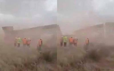En las imágenes se puede ver cómo el muro se desploma por el viento y la lluvia. En el lugar se encontraban varios trabajadores, quienes no resultaron lesionados.