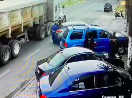 Este es el momento justo cuando un hombre de oficio mariachi es arrollado por un automóvil que lo proyecta a las ruedas de un tráiler que circulaba en la carreta vía corta Puebla-Santa Ana Chiuatempan.
