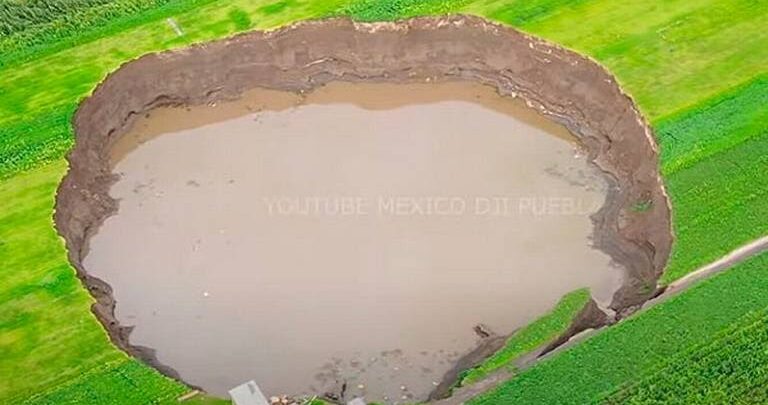 El socavón de Puebla sigue sorprendiendo y ahora este hundimiento generado desde el 29 de mayo en campos de cultivo de Santa María Zacatepec, deja ver una cascada generada por las recientes lluvias.