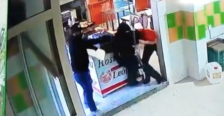 Esta escena también fue apreciada por una persona que al parecer sale de otro local, ya que se alcanza a ver que usa un delantal blanco, sin embargo regresa corriendo al sitio de donde salió.